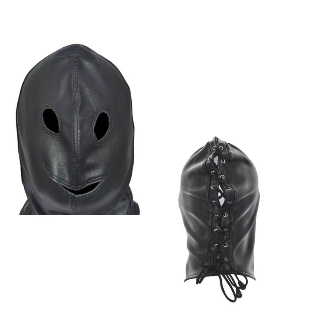 Máscara de eco cuero con cierre acordonado y aberturas de ojos y boca.